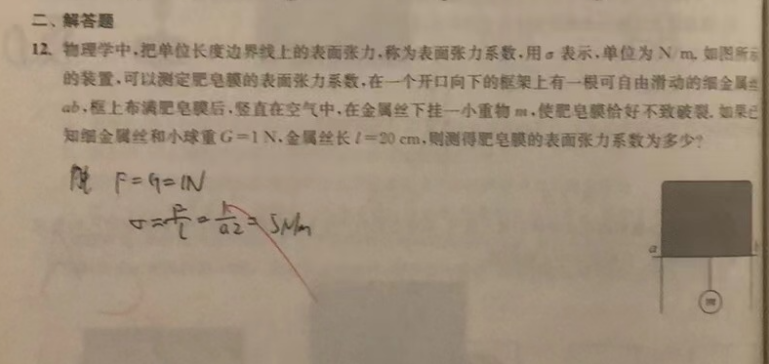 江苏,5月13日,物理,《高中物理·小题狂做·选择性必修第三册 RJ·II》: P 42,题12 。疑惑是肥皂水膜为什么有两个表面?σl为什么要乘2
